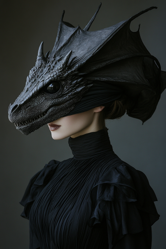Profile full body Portrait of a woman in a black dress with a dragon skull on her head, covering part of her face, with very large black eyes. She is wearing a black dres in front of a beautifully posed wallpaper --ar 2:3 --v 6.1