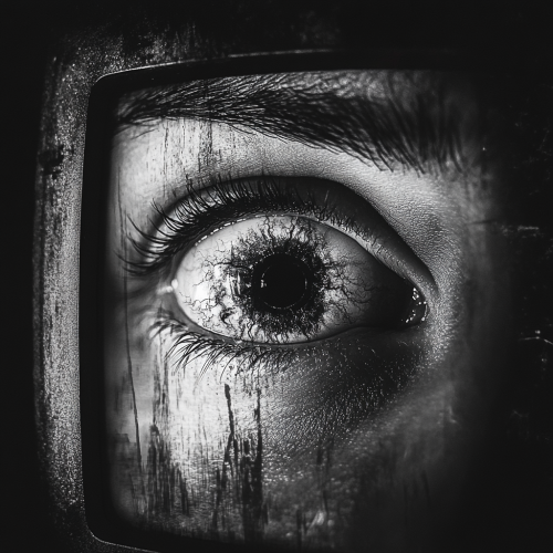 a realistic picture of a woman’s eye wide open with a terrified expression. The picture has a static and grain as if from an old TV and is in black and white with a horror aesthetic