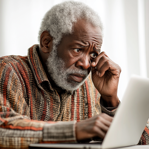Generate a digital art for A digital art scene showing a candidate sitting at a desk with a computer, looking worried and confused, with a thought bubble showing a missed email notification. The background is dark grey, symbolizing the color black, to emphasize the seriousness of neglecting follow-up. --ar 1:1 --quality .5