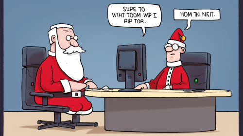 cute holiday political cartoon, worried santa standing in front of a scheming man at a desk with an ai christmas santa robot --ar 16:9 --v 5.0