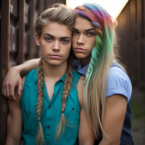 Campy femme gay man and his serious butch lesbian best friend, both have dyed long hair