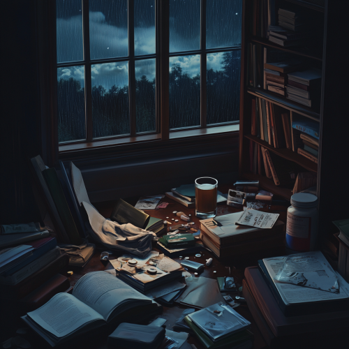 A dimly lit room with a messy floor covered in scattered books, clothes, and empty pill bottles; a cold cup of tea sits forgotten on the cluttered table. Outside, a stormy night sky fills the window, casting faint shadows. Realistic style, close-up shot, showing the neglected state of the room. --s 50 --style raw
