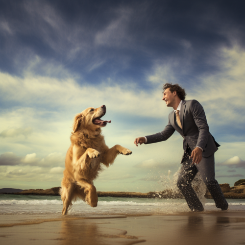 photograph of a golden retriever and a young couple playing on the beach in australia --v 5.1