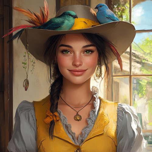 in a western setting a middle class caucasian woman in grey attire with yellow vest on her hat there are feathers of colorful birds. She has darkbrown hair and bright emerald green eyes. she smiles slightly reassuringly with soft body language. clean digital art style