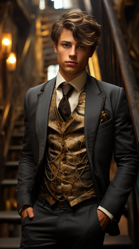 a cute 20yo Western boy. A narrow, winding staircase within a medieval tower, leading up to the unknown.vibrant colorful portrait.High fashion or business or evening wear.Fullbody shot, professional photography ::1 backhead ::-0.2 profile ::-0.1 --ar 9:16 --seed 20007772 --style raw --stylize 1000 --v 5.2