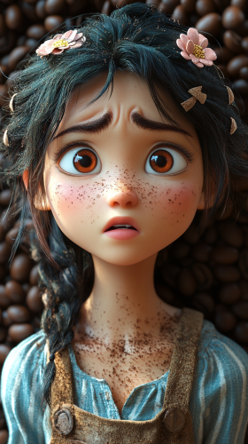 filipino girl stressed out crashed out in coffee beans and coffee spilled all over she's tired with baggy eyes pixar style 3D animation character --ar 9:16 --s 750