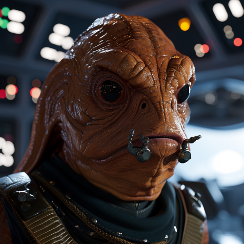 A 3D rendered visualization of a very close up shot of Admiral Ackbar. Detailed, light and dark elements, dynamic, cinematic::3 --v 6.0