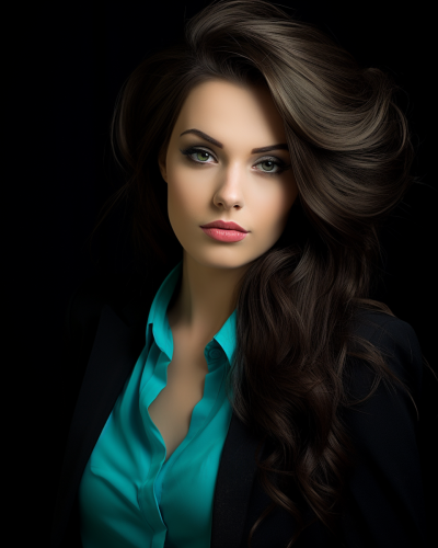 confidence, young lady, turquoise blue and black, --ar 4:5 --style raw