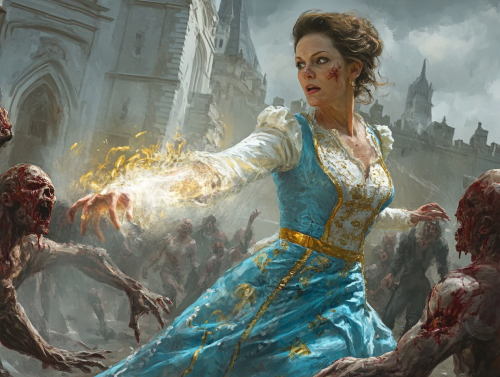 A young female mage dressed in a bright blue dress with a white top with gold trims. She is casting a spell to banish a confused zombie while another zombie is looking confused. Grey weather but daylight, White castle in the background under attack by more zombies.