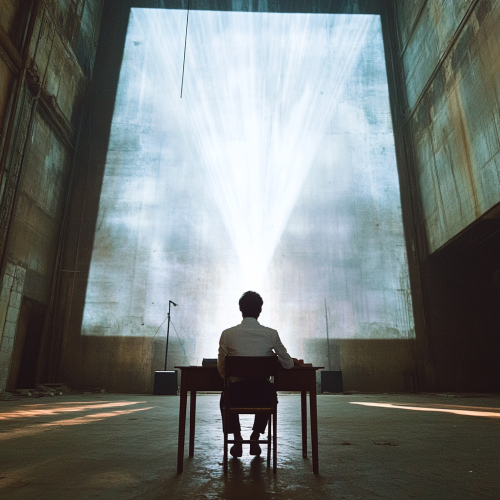 inside a massive abandoned grain storage facility, a young stylish man sits off center of the frame at an old desk with his back to the camera, watching a light show that asymmetrically is projected onto the wall in front of him, hyperrealistic