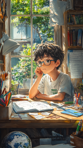 "A young man sitting at a desk, showing clear signs of brain fog. Their expression is dazed and slightly confused, with furrowed brows and half-closed, tired eyes that appear unfocused, staring blankly ahead. They have dark circles under their eyes, suggesting fatigue or lack of sleep. One hand is placed on their forehead, as if trying to concentrate or remember something, while the other hand rests on an open book or laptop keyboard. Their posture is slouched, shoulders slightly hunched forward, indicating low energy or mental exhaustion. The background is softly blurred, emphasizing a sense of mental haze and difficulty concentrating. A dimly lit room with scattered papers, a cup of cold coffee, and a clock showing late hours adds to the feeling of mental fogginess and struggle.