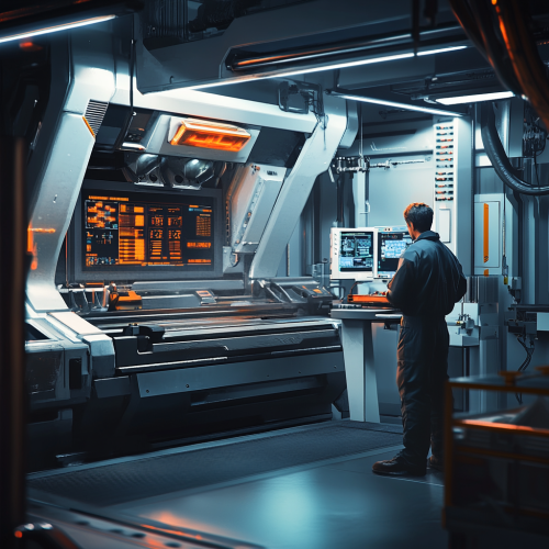 A hyper-realistic, detailed view of a high-tech milling machine inside the factory, showing polished metal surfaces and digital control panels. The worker monitoring the machine is dressed in a sharp, modern uniform. The factory is bright and clean, with organized tools and safety signage. The lighting and colors are adjusted to match the style of the reference image, emphasizing every fine detail in a photorealistic way that showcases the modernity and efficiency of the machinery.