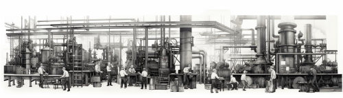 diagrammatic drawing of east european factory, single worker, --ar 7:2