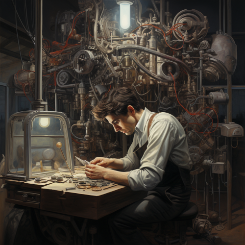 Diego Rivera's painting depicting 12 workers sitting around and watching an engineer building an engine. The one working on it is holding tools in their hand. In the background is a busy factory