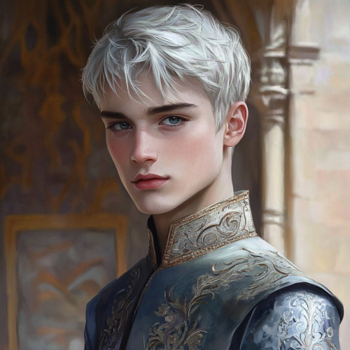 An 18-year-old Valyrian youth from House Velaryon, with short silver hair that shimmers in the light and intense violet eyes, radiates a natural charm that draws people to him. His handsome features are unmistakably masculine, with a strong jawline and a confident, easygoing smile that makes him approachable. Though he lacks the hardened appearance of a warrior, he carries himself with a relaxed yet distinctly male elegance. Girls are especially drawn to his friendly, likable demeanor. Picture him painted in the soft brushstrokes of Impressionism, where the light plays off his silver hair and violet eyes, creating a portrait full of warmth, capturing his youth and quiet confidence, clearly portraying him as a striking young man, not at all feminine in appearance.