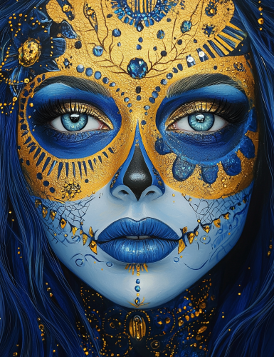 Full portrait of a beautiful young woman, Day of the dead catrina, AI goddess creative face painting, looking straight, blue and gold, surreal, intricate details, gems, big eyes, long hair, beautiful lips, futuristic background --ar 2588:3375 --q 2 --v 6.1