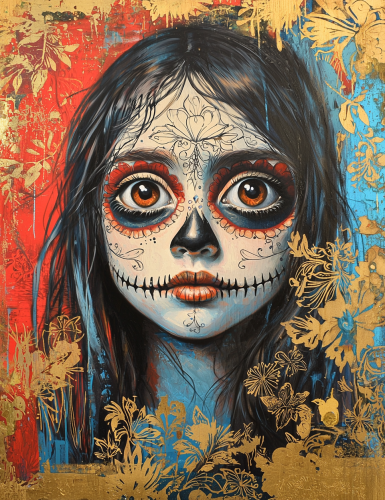 Photorealistic young woman, Day of the dead catrina, big eyes, long hair, red, gold, blue, black and white, intricate details, looking straight on, natural light, --ar 2588:3375 --q 2 --v 6.1