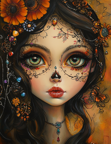 Portrait of a beautiful young Day of the dead catrina, creative face painting, surreal, intricate details, gems, big eyes, long hair, beautiful lips, --ar 2588:3375 --q 2 --v 6.1