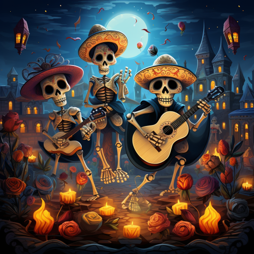 dia de los muertos, day of the dead, cemetery, with the focal point of a center memorial house, disney coco themed, bright vibrant colors --ar 16:9 --v 5.2