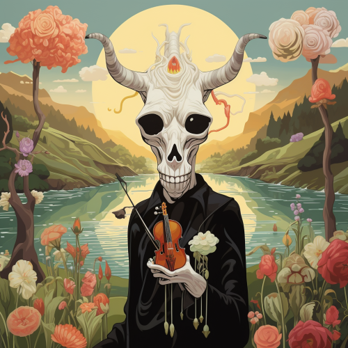 day of the dead art ilustration of skull holding a staff in a lake garden of apple trees next to a goat--ar 7:12
