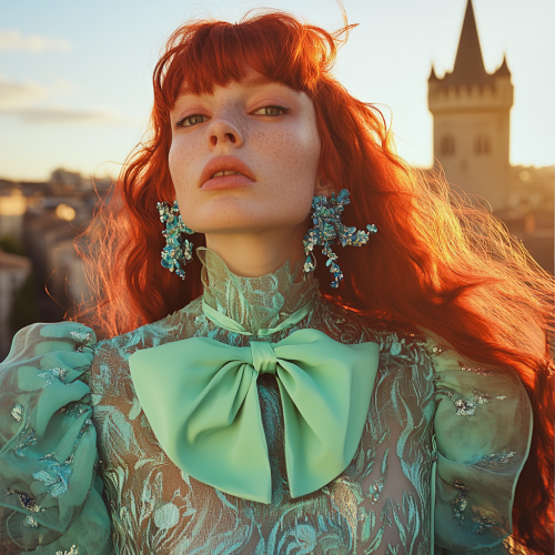 A striking fashion portrait of a woman with long, wavy bright red hair. She is wearing a bold, avant-garde outfit with a large mint-green bow at the chest and voluminous sleeves with light blue, wave-like patterns. Her accessories are oversized blue floral earrings and a glittering green choker necklace. The background features a sunlit cityscape with an old European tower. The lighting is bright and natural, emphasizing her confident pose and flawless, porcelain skin. The style is high-fashion, artistic, and bold. --s 50