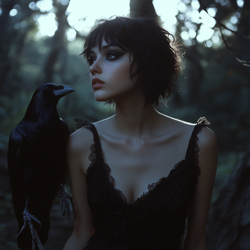 a full body image of a slender young woman with black eyeshadow, short messy black hair. she is wearing a black gothic dress. she is walking through a dark forest, backlit by moonlight. her crow familiar flies next to her. d&d, fantasy, deep shadows, dramatic backlighting.