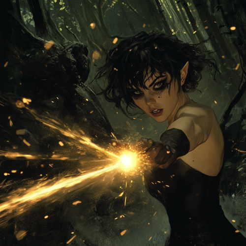 a depiction of a slender young woman with black eyeshadow, short messy black hair, and a black gothic dress. she is shooting magic missiles from her hands at a monster in a pitch black haunted forest. d&d, fantasy style, action scene, dramatic angle.