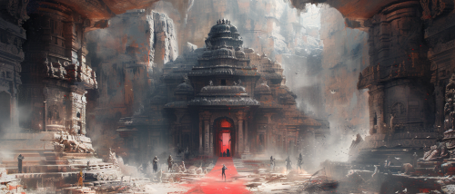 the interior of a indian cave with throne chair surrounded with many monsters, and one person on a red carpet, in the style of andreas rocha, ethereal forms, bronze and crimson, monumental murals, heavy use of palette knives, reimagined religious art, crystalcore , indian architecture style --ar 7:3 --stylize 300 --v 6.0