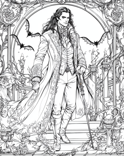 Create a coloring page horror comic book design of a very handsome man wearing a white Victorian Themed Count Dracula .This handsome man has long white wavy Hair and is standing in a spooky mansion stairway. He is carrying a beautiful and elegant walking cane that has a large jewel on the top. What he wears is very ornate and elegant and flowy. A wide shot so we see him from head to shoes on how fabulous his costume is as he looks directly into the camera. There is a huge full moon in the background with large vampire bats flying around and spooky trees. This scene is framed in a large wooden circle frame that has fancy filigree and swirls engraved into the wood. This is a complete line drawing with no shading or shadows. --ar 4:5 --v 6.1