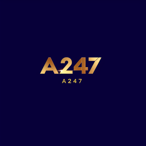A magnificent, technology-driven, futuristic gold logo on a dark blue background with the brand picture "A247". The image is wide in breadth but modest in height. --v 6.0