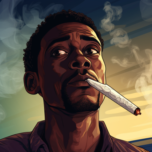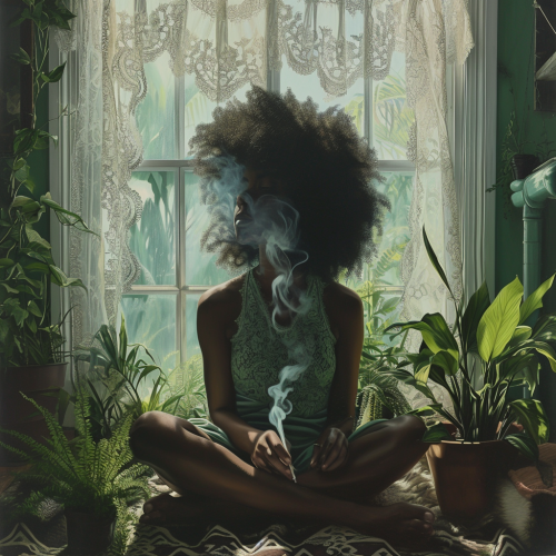 a black woman with a large afro smoking a blunt sitting in her bedroom with plants all around and open window with white lace curtains wearing green new Orleans style --v 6.0