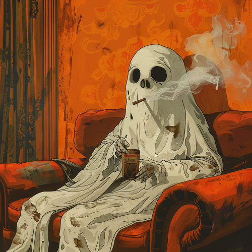 a ghost on a couch smoking a blunt, orange background, style of Famous Cartoon on Adult Swim --v 6.0 --s 250