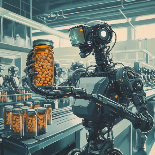 A robot holds up a pill bottle and places a capsule in it in the foreground. Behind the robot is an assembly line being worked on by many other happy robots. Please make it clear they are placing pills in medicine bottles. High tech. Futuristic. Not too busy.