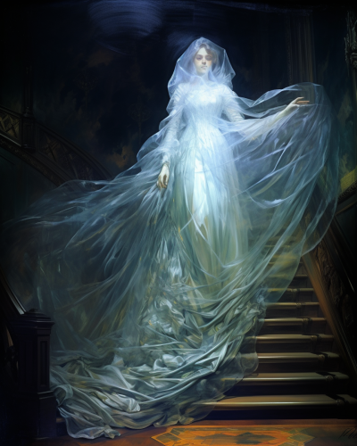 Mucha, vasnetsov, sargent portrait of a transparent ghost woman cloaked in gauze. Flowing metal chains. Abandoned Victorian mansion foyer. Flowing strands of ectoplasm. Midnight. Night time. --ar 4:5