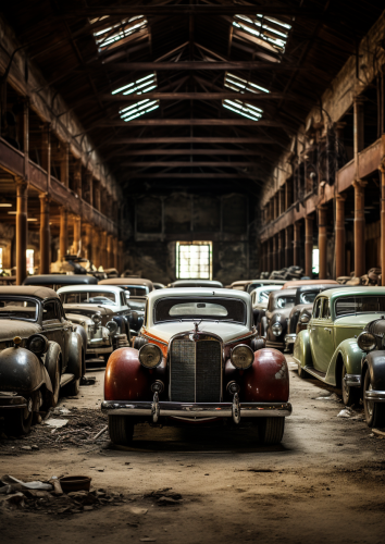 hangar full of classical cars, once it was an unique collection of a rich man, preserved time capsule of automobiles --ar 5:7 --v 5.2