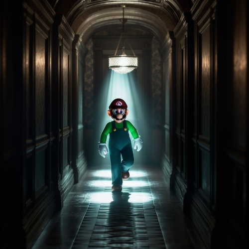 ultra realistic of a corridor of an abanoned mansion with dusty corridors with a shadowy figure in the distance ar 9:16