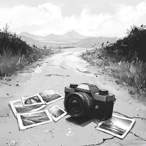Black and white, Disney-style illustration. An old, abandoned camera lies on the side of a dusty road, with a few photographs scattered around it, showing distant and exotic places like mountains, beaches, and cities. The road stretches out to the horizon, and some wild plants grow nearby, creating a sense of solitude and nostalgia