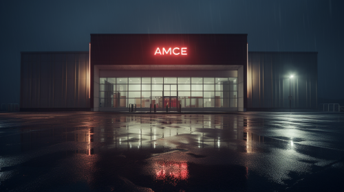 AMC movie theater exterior abandoned and falling apart. hyperrealistic. Night time. Dark colors with spotlights. --ar 16:9