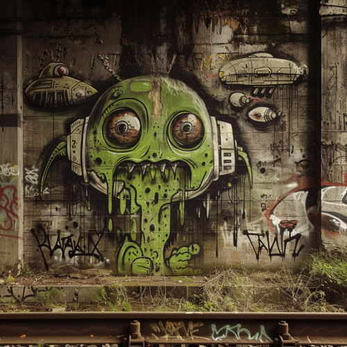 super weird grafitti with space robots alien green slime steel surfaces scorched space ships wide scene with many things happening on a wall at the railway super detailed super realistic professional photography --v 6.0