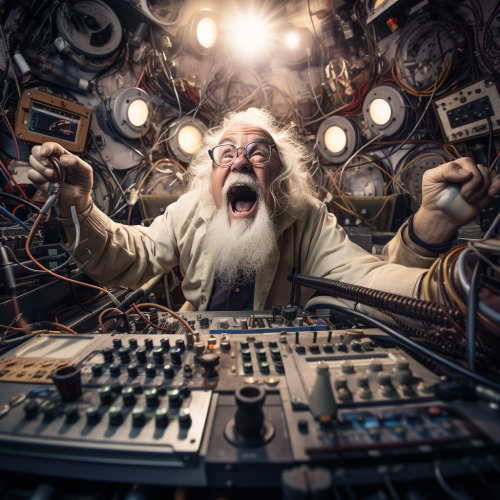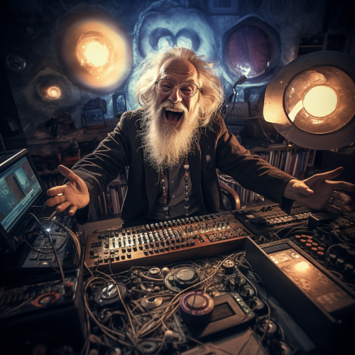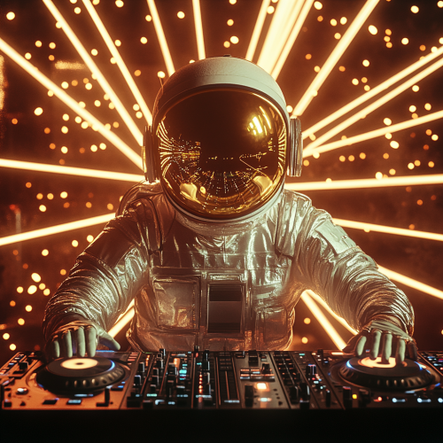 futuristic astronaut with DJ headphones, at electronic party, with DJ console, infinite neon light panels behind, realistic atmosphere, high resolution, y2k style, fine details, front view, out of focus in some parts, black and gold atmosphere, laser rays crossed , stage with people, 8k, cinematic, color grading, real photo, Taken with a Canon AE-1 using 13mm Kodachrome film. In the style of Philip-Lorca diCorcia's photography. --v 6.1