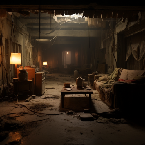 Movie scene design, abandoned residential building, China, future, interior of the house, 2040, uninhabited, dilapidated furniture, full of dust, warm colors,creepers plants growing