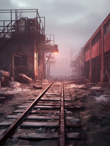 a realistic abandoned and ruined industrial warehouse with train tracks with barriers, wine red and red color grading, dust, snow, mist environment --ar 3:4