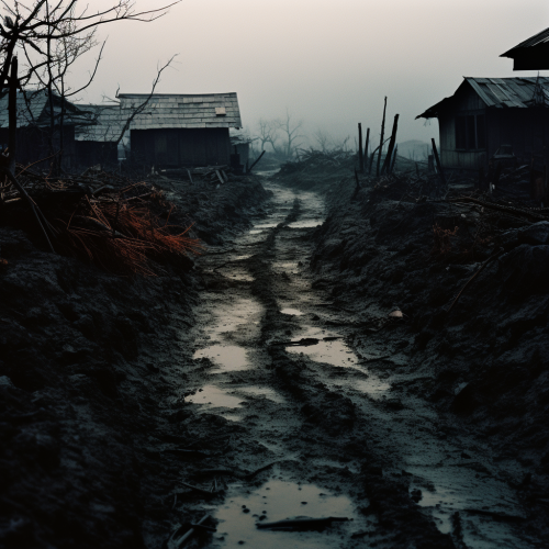 A dark and gloomy landscape taken with a 35mm HD canon camera that has dust and scratches on the lens. The landscape shows a trail of large, clawed footprints left by a red dragon that flew over the area. The footprints have crushed and burned several wooden houses that were abandoned by the villagers. A murky river flows through the landscape, carrying debris and ashes from the destruction.