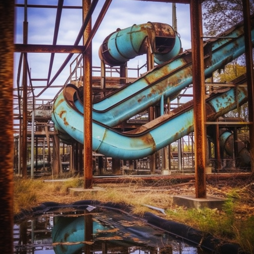 A rusted abandoned waterpark. Water and rust mix and stain the slides and walkways. --v 5.1