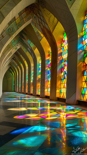 imagineModern iranian mosque interior with geometrical stained-glass windows, vibrant reflections across a marble floor, futuristic arched pillars, minimalist design, sunlight casting dynamic color play, golden-hour lighting, sharp details, persian colores, hd quality, stunning color contrast of blues, persian greens, and persian yellows at 1990 --ar 9:16 --v 6.0