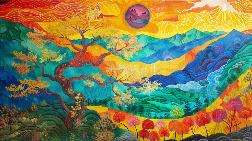 Bhutan healing art, painting, joy, Bhutan colors, Bhutan culture --no picture of a person --style raw --ar 16:9 --v 6.0