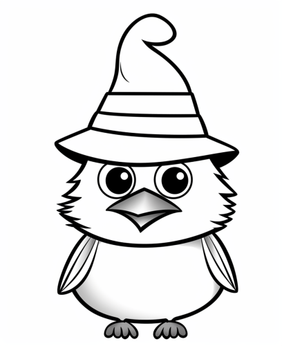 A coloring page for children ages 3-5, very simple, continous line drawing, a cute chickadee wearing a cute hat, thick crisp minimal lines, minimal white background, black and white, --no shading --ar 9:11 --style raw --v 5.2