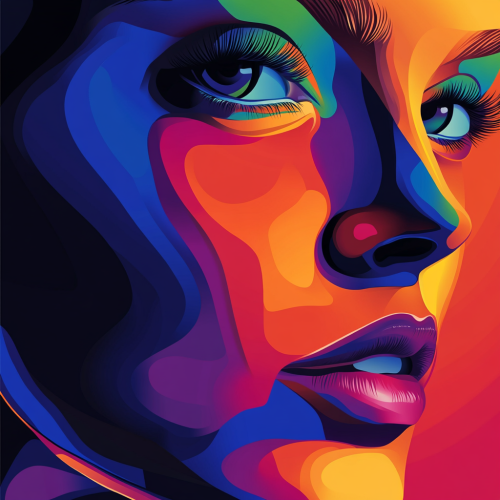 make a design, composition must be visually balanced. put 1 human face and blend it with basic shapes. only use solid colors and basic gradients and make colors very contrasting each other.