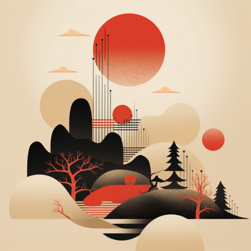 Generate an abstract line art piece filled with intricate geometric shapes inspired by mid-century modern design. Emulate the boho-chic style with a focus on organic patterns and neutral tones on dark background, architectural sightseeing city element s of Kuwait --no mockup --ar 16:9 --s 750