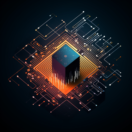 logo of a tech company rhombus with equal sides strong shadows elegant abstract art geometric forms the word "doings" is printed below microchip circuits abstraction